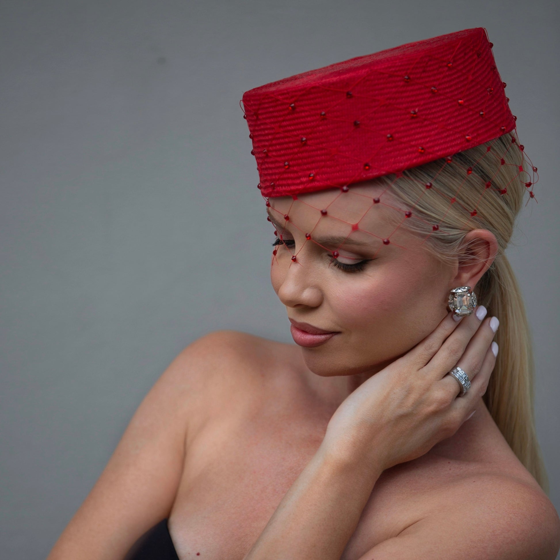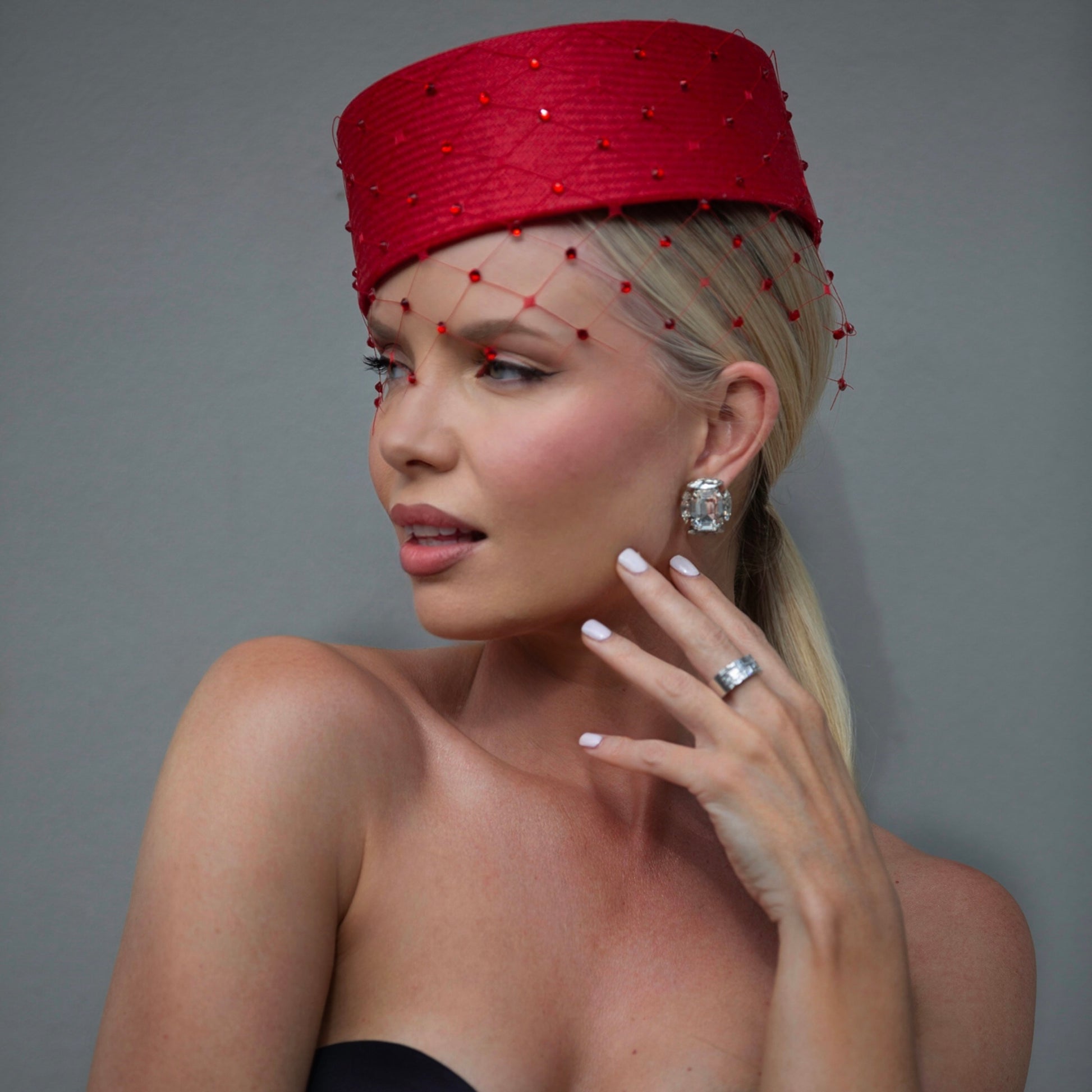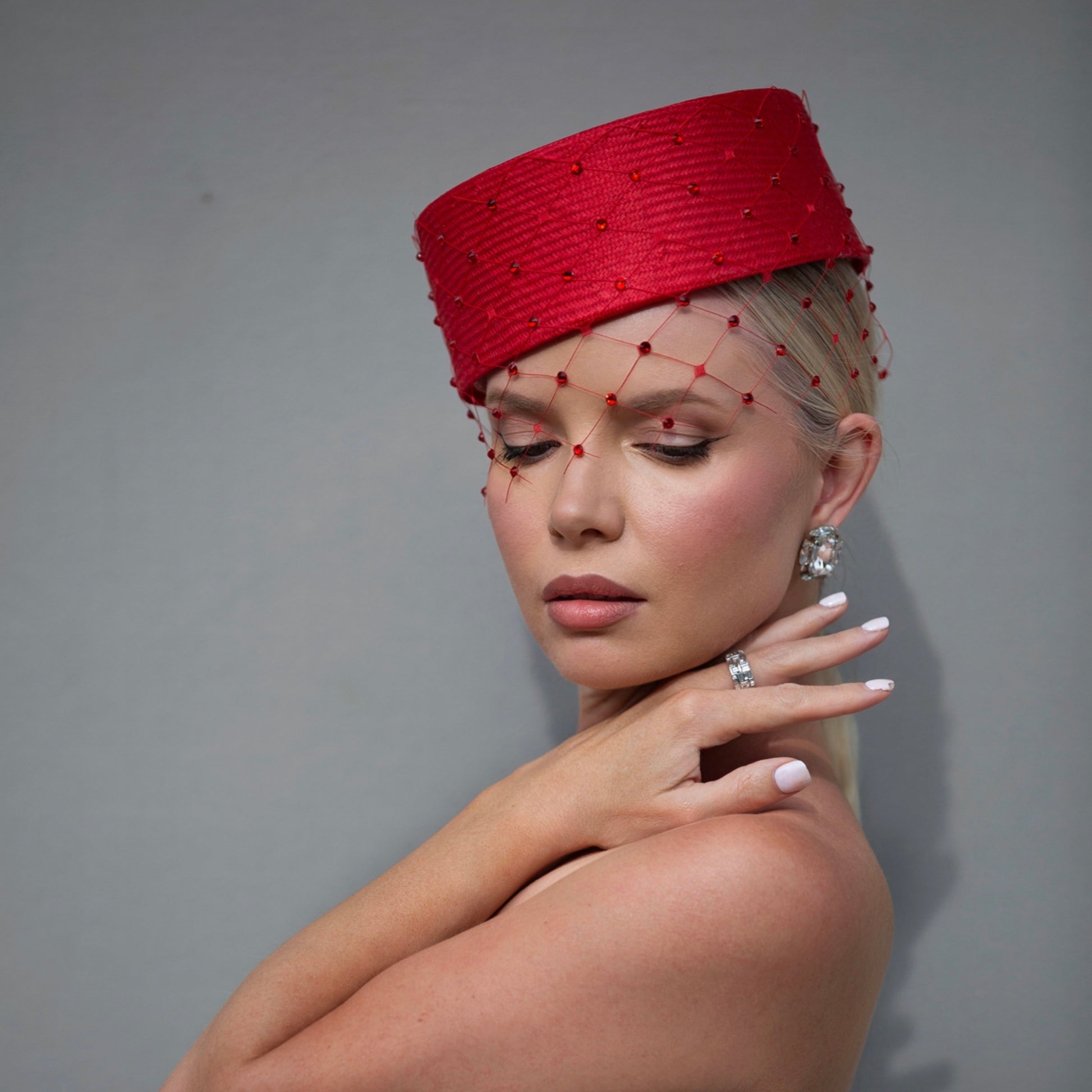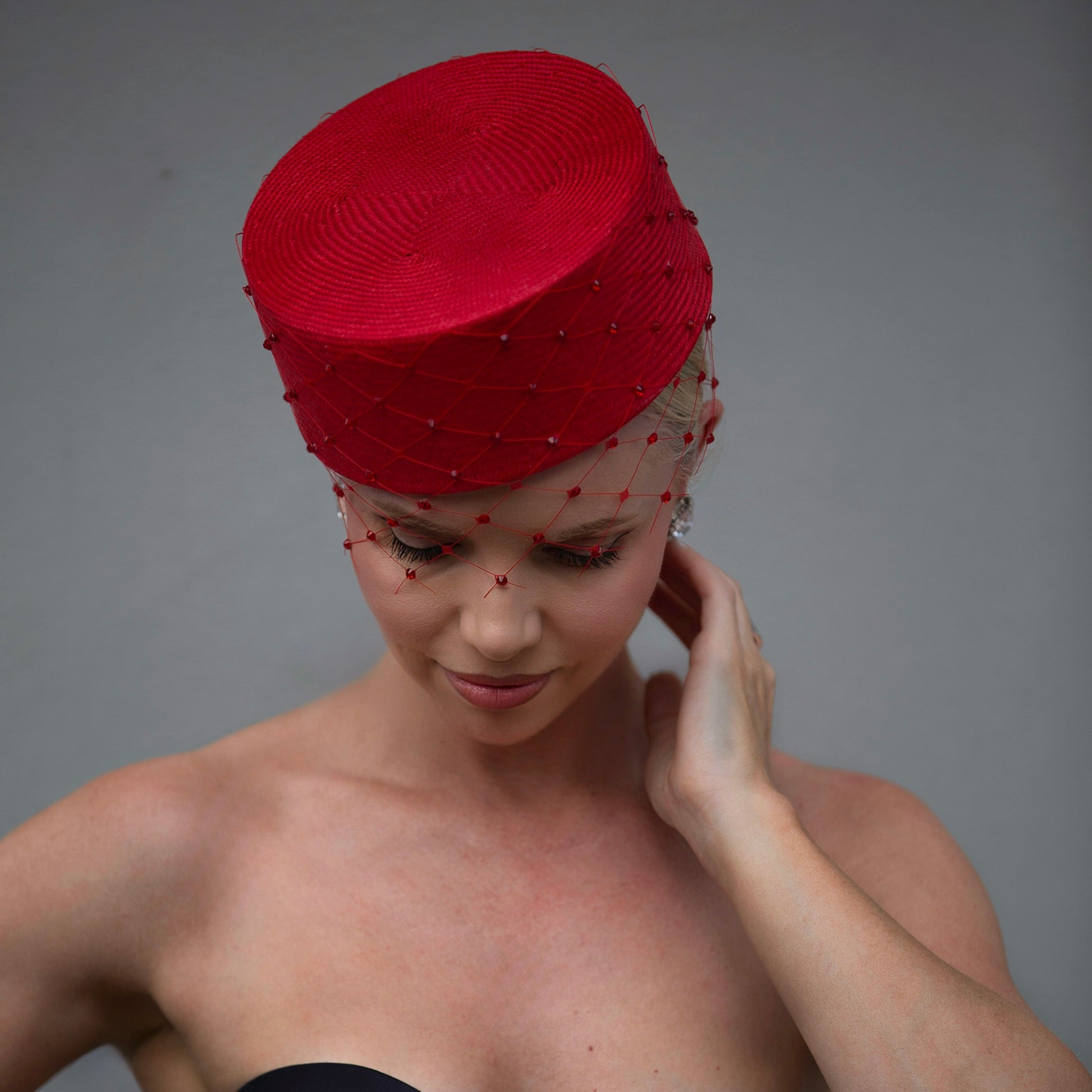 Our statement pillbox style in cherry straw; finished with matching wide-window veiling and red Swarovski crystals.