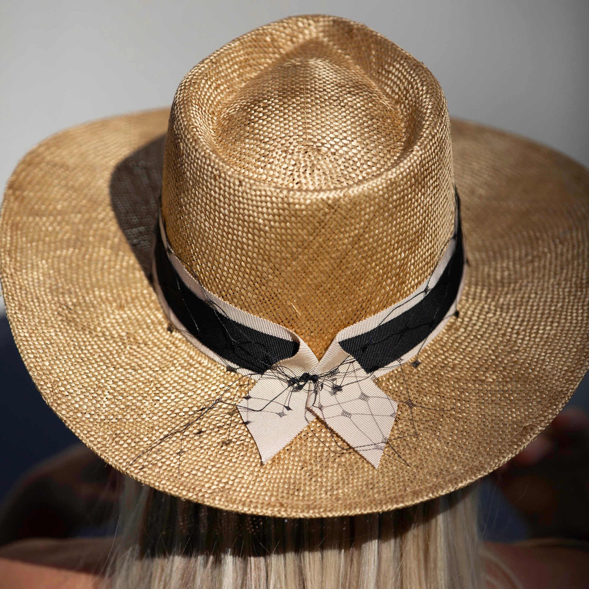 A golden straw piece with the tiniest hint of a cowboy shape. Finished with black veiling detail and gold buckle.