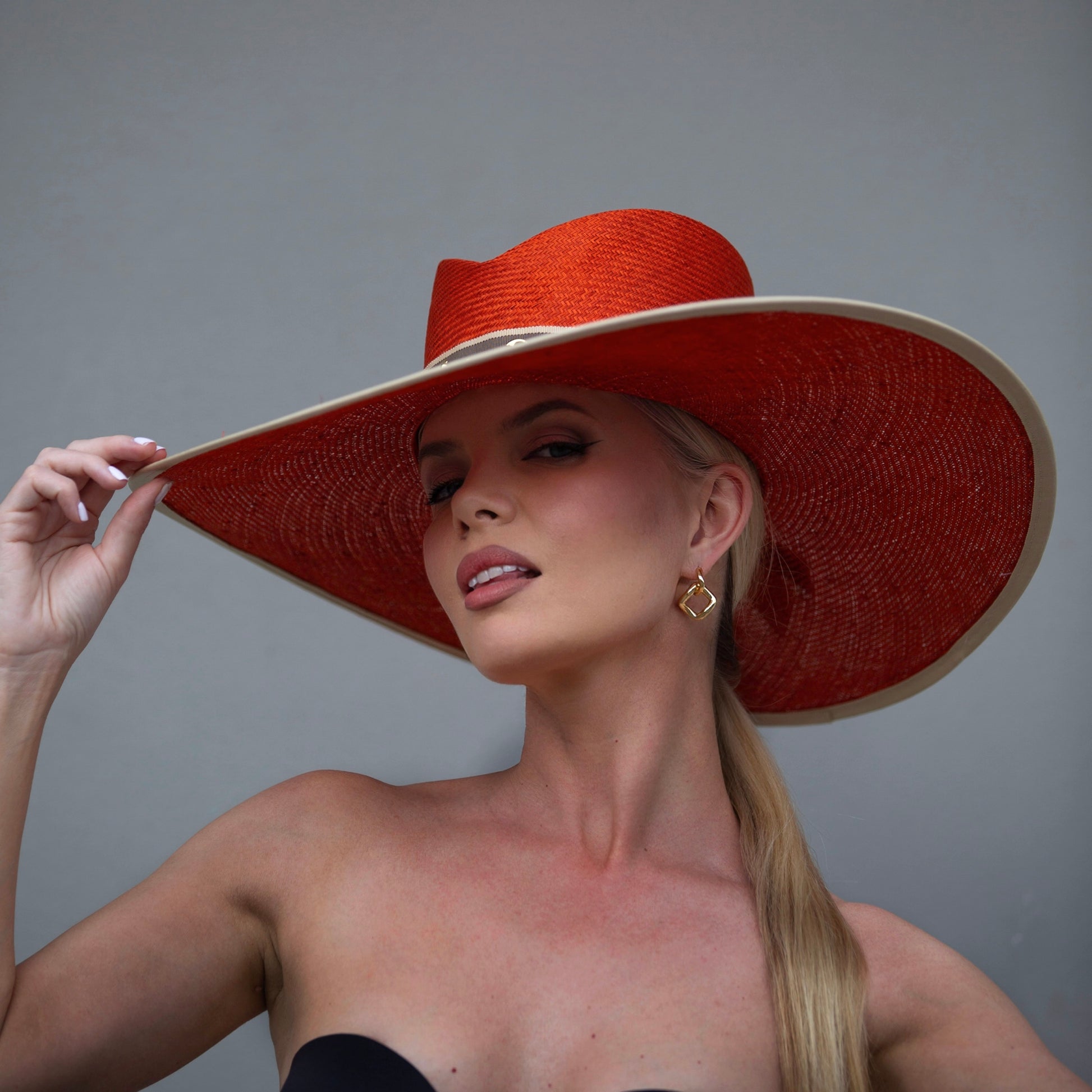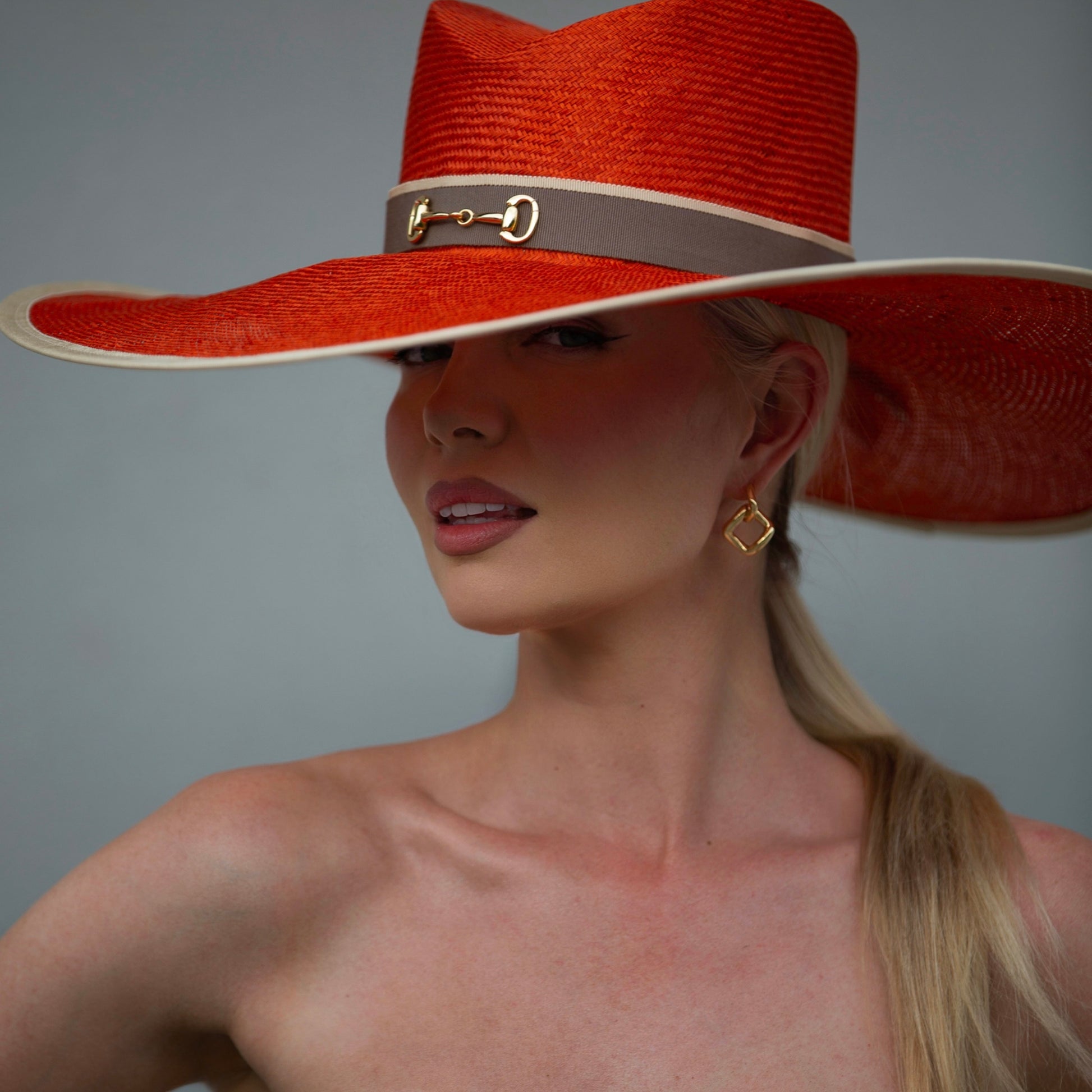Gorgeous orange/rust straw in a statement brim shape. Finished with natural/taupe ribbons and gold buckle.