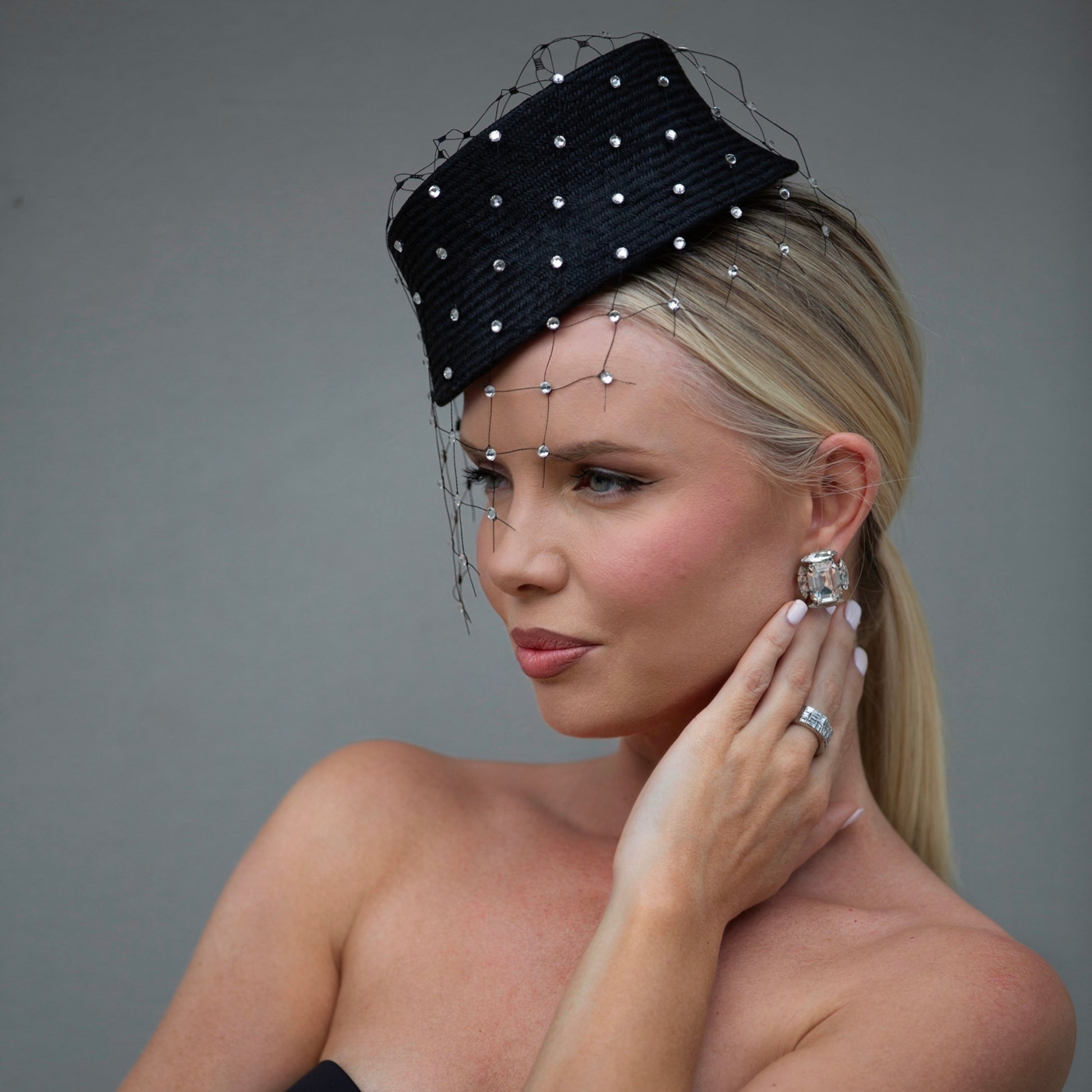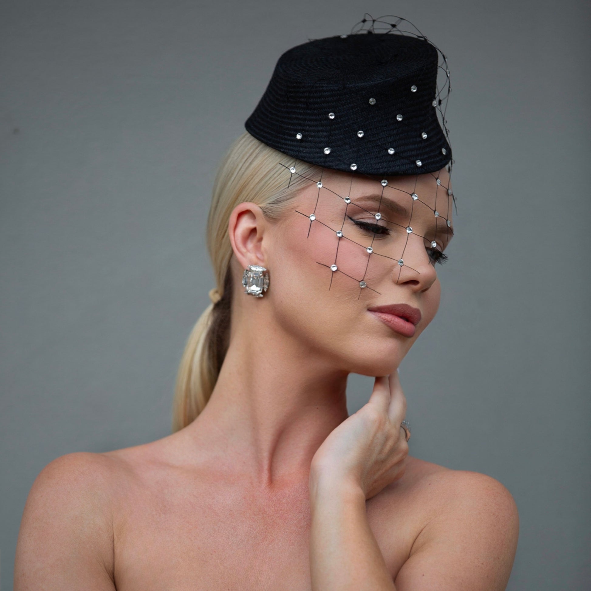 The perfect little vintage shape, finished with modern wide-window veiling and Swarovski crystals.