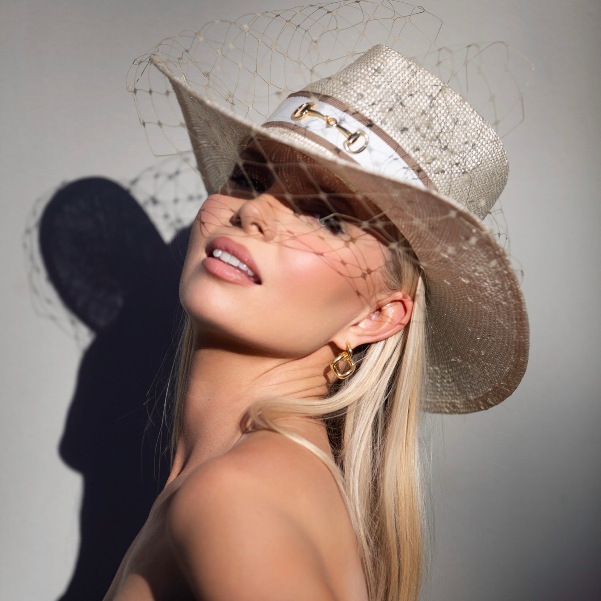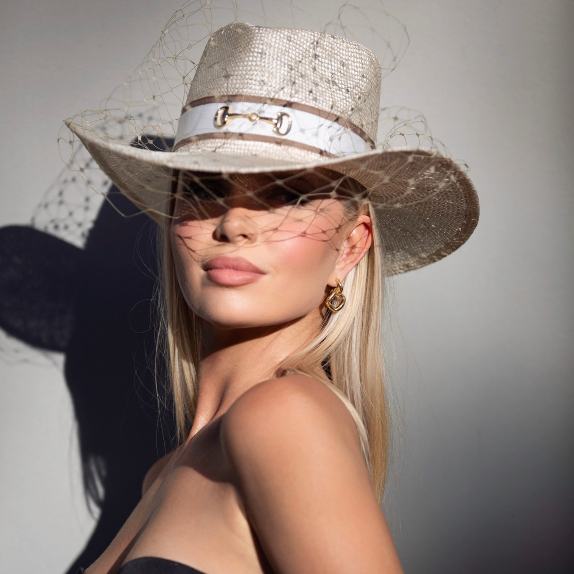 The perfect cream polo hat with a hint of classic cowboy. Finished with taupe/ivory ribbons and taupe veiling. A gold buckle is the statement.