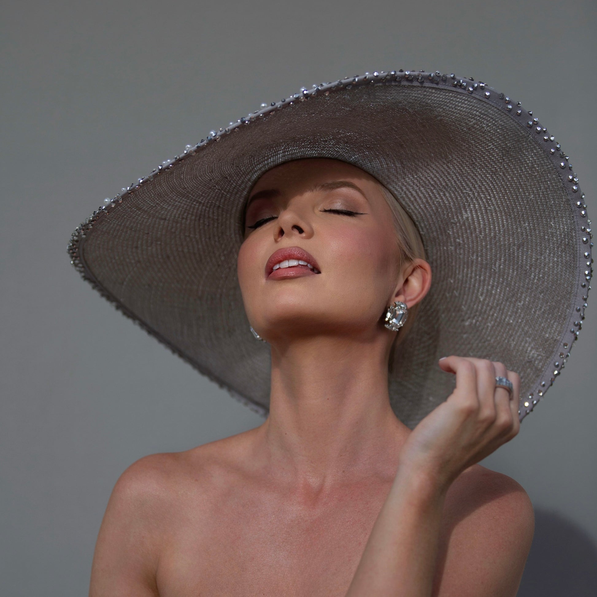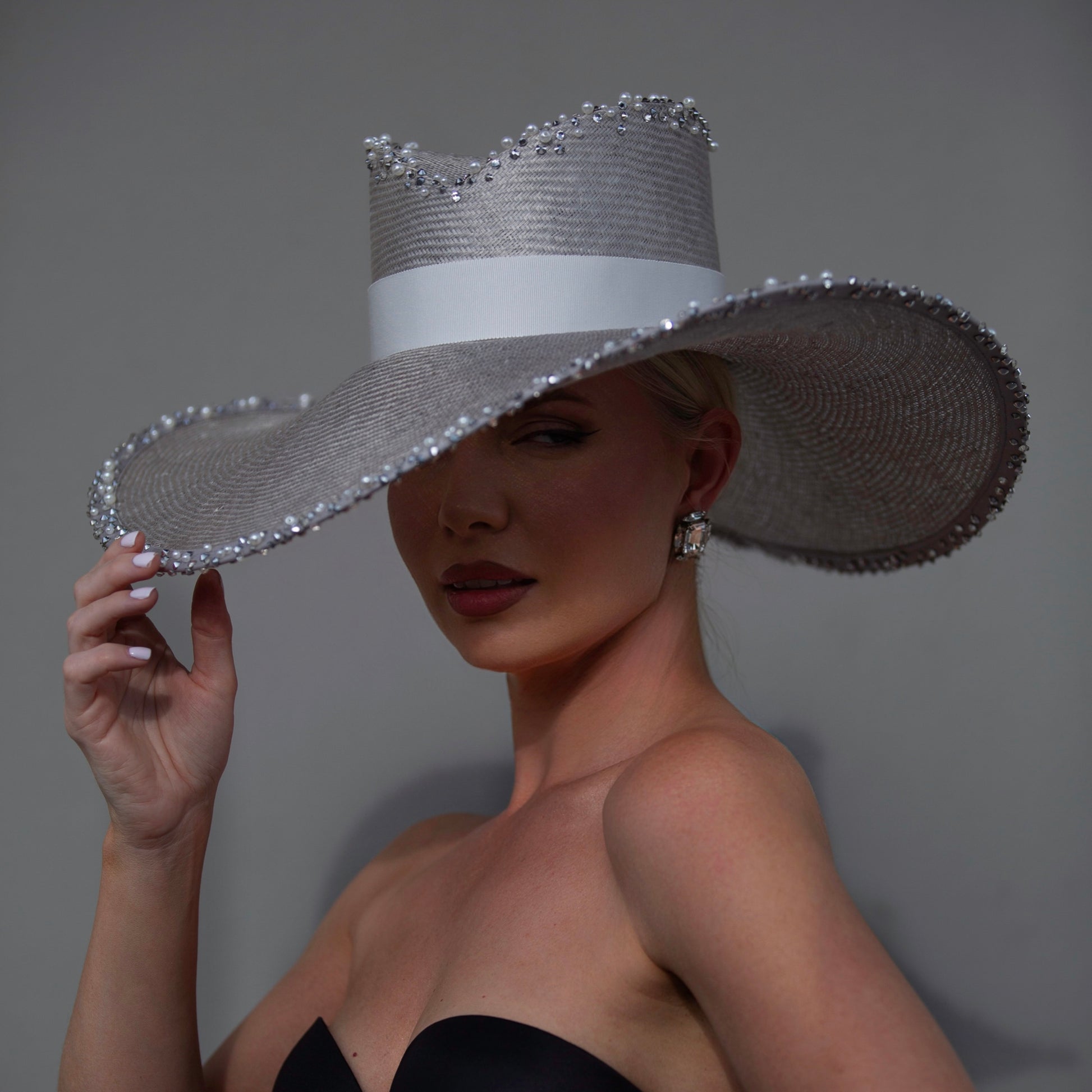This stunning hat is crafted out of a silver/grey straw and is encrusted with a mix of Swarovski crystals and white pearls. Finished with a white ribbon.
