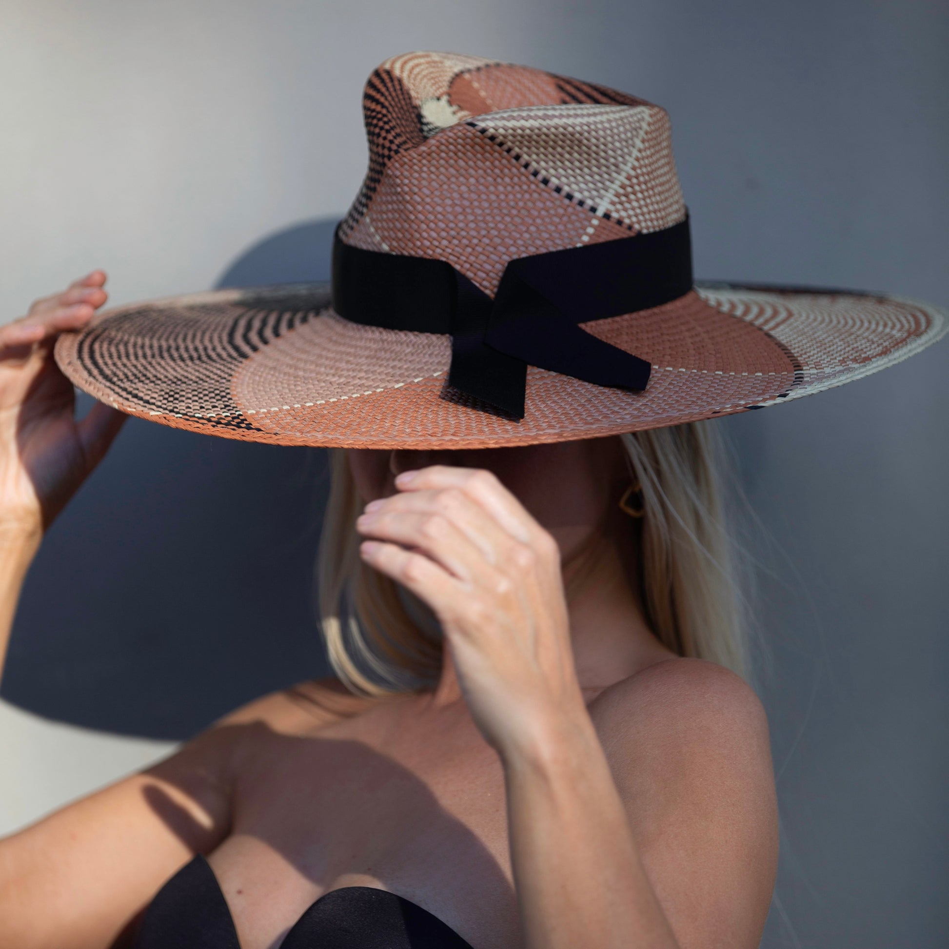 Part of the summer Panama range; this statement patchwork piece is blocked in a classic fedora shape and finished with a black ribbon.