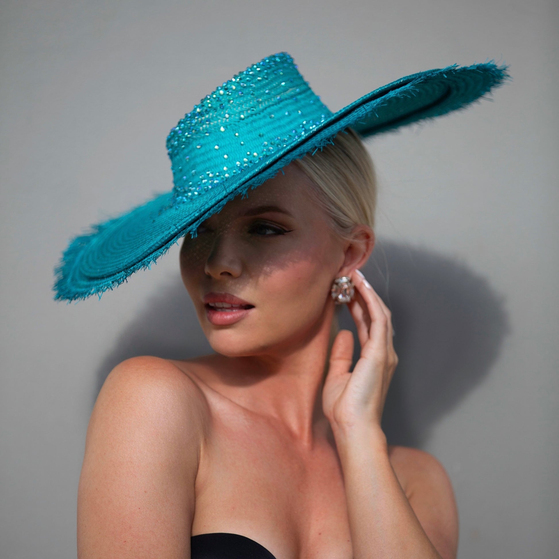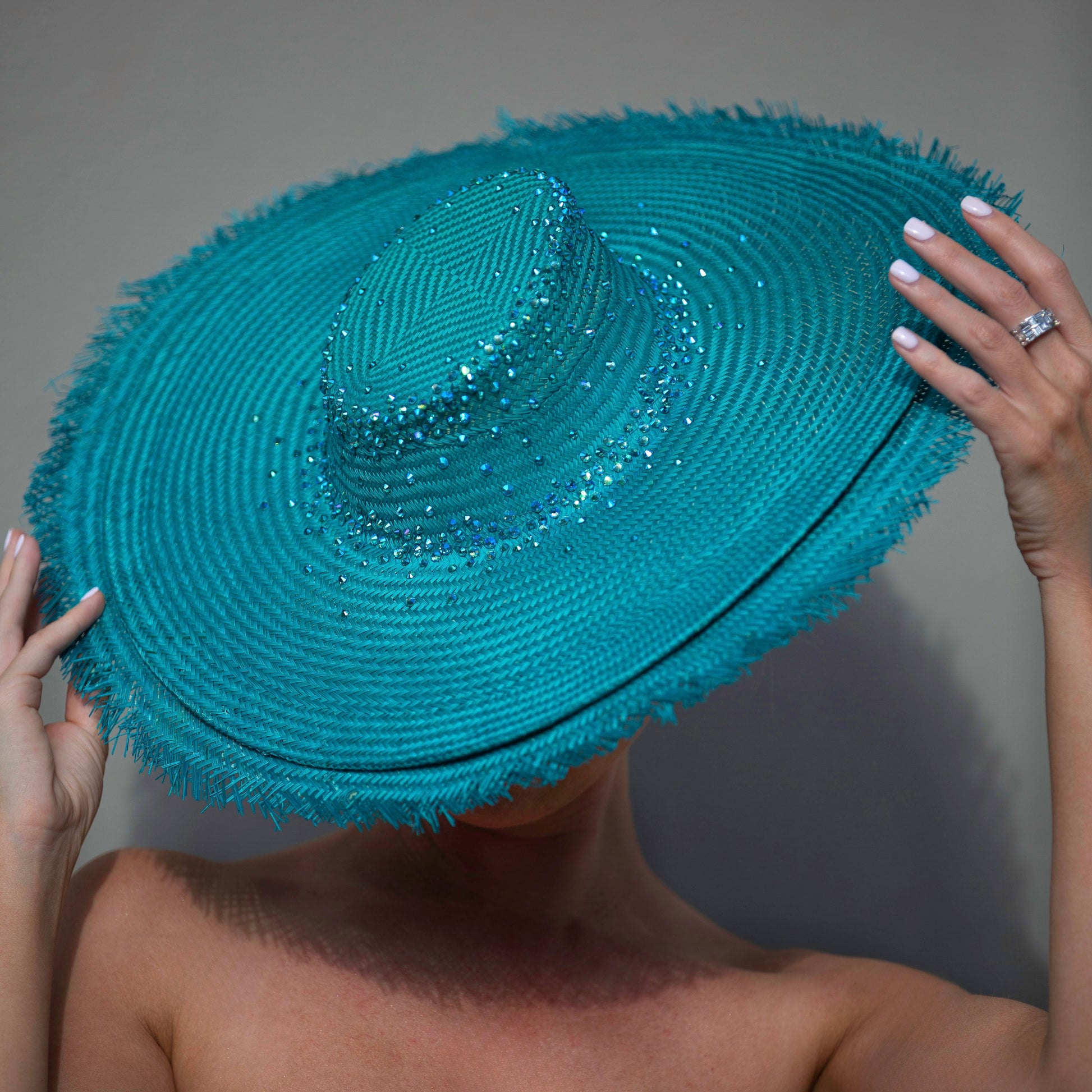 A stunning teal straw; finished with a frayed edge and encrusted with blue/teal Swarovski crystals.