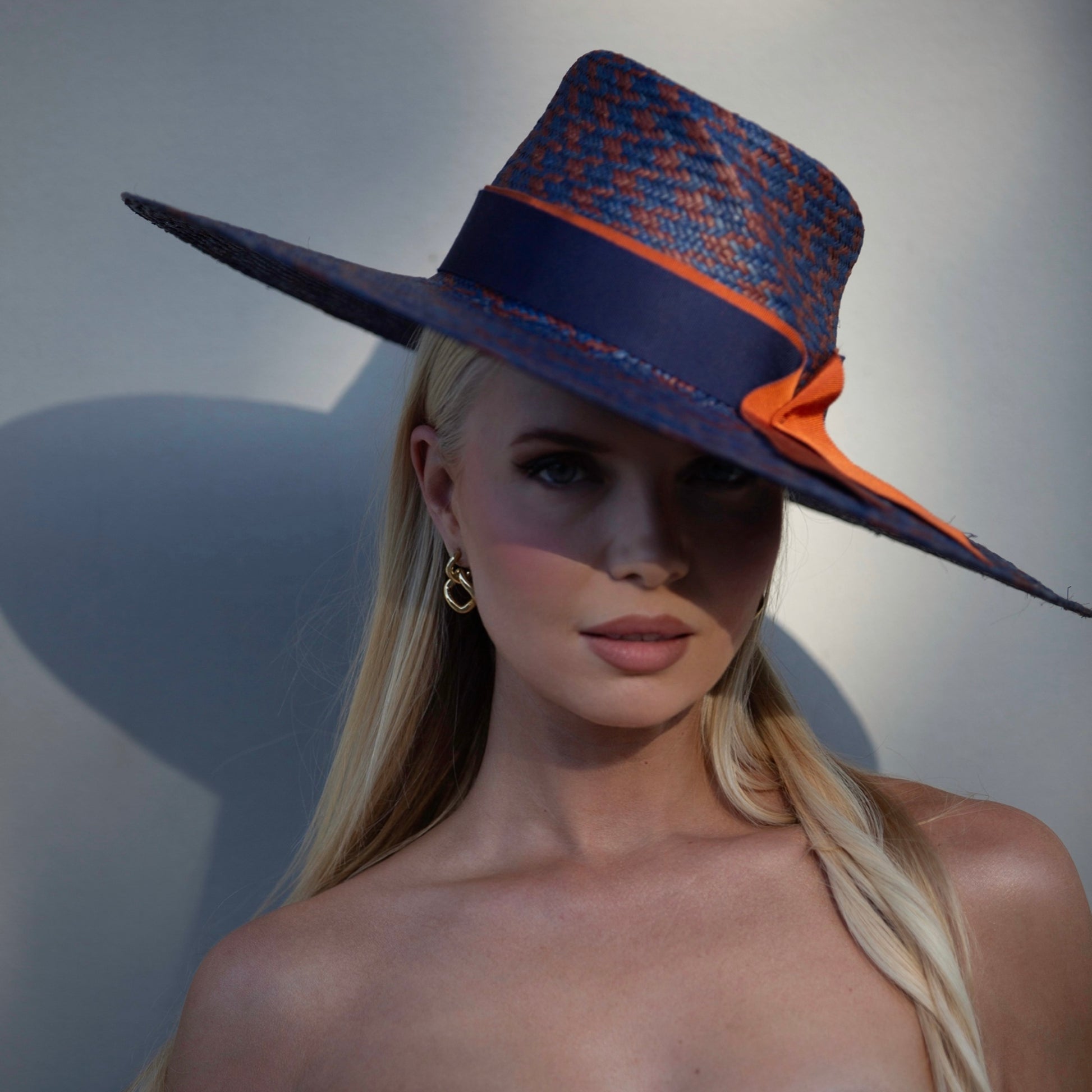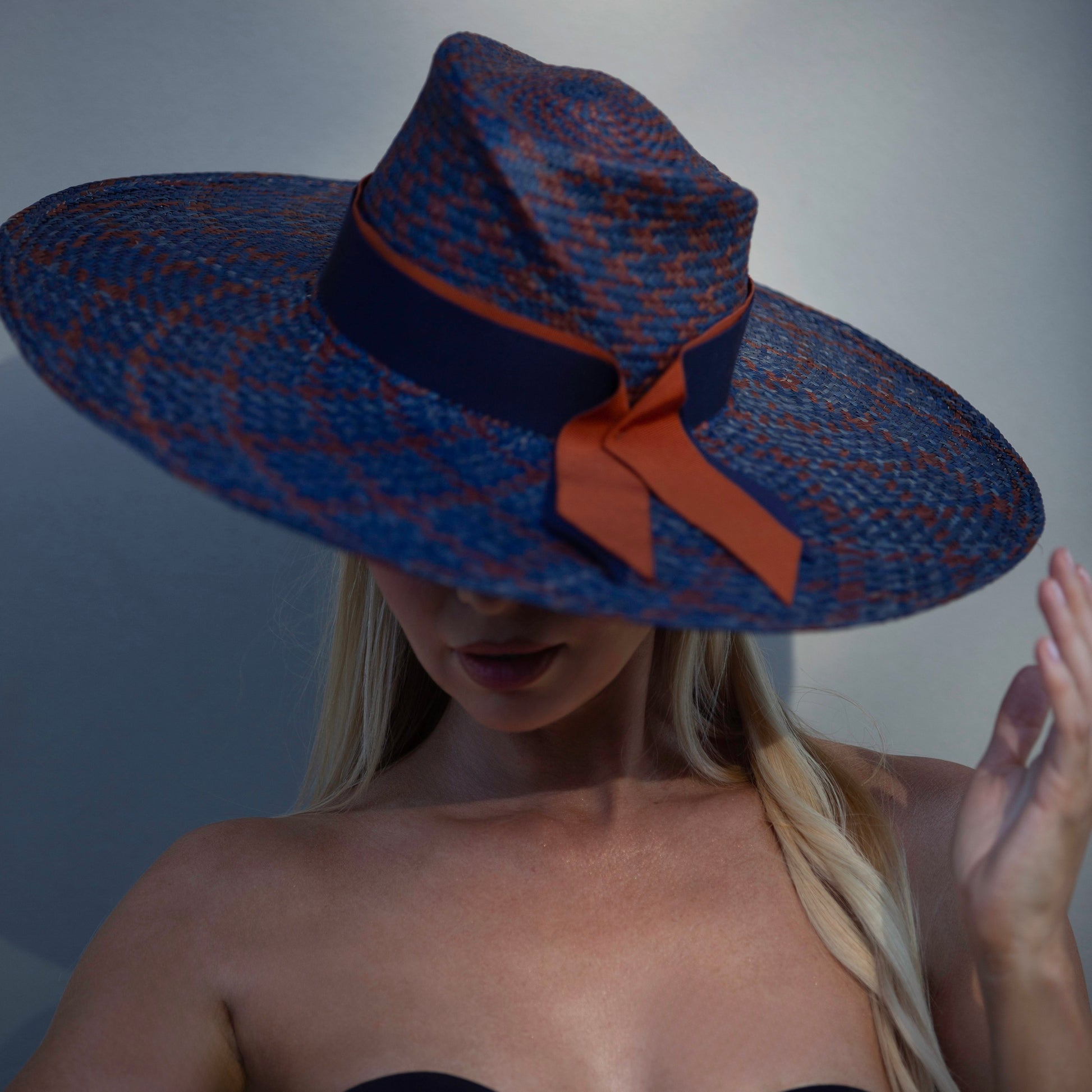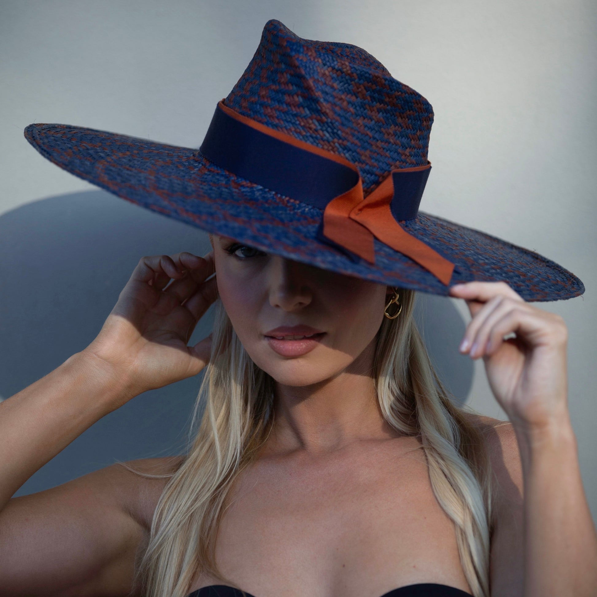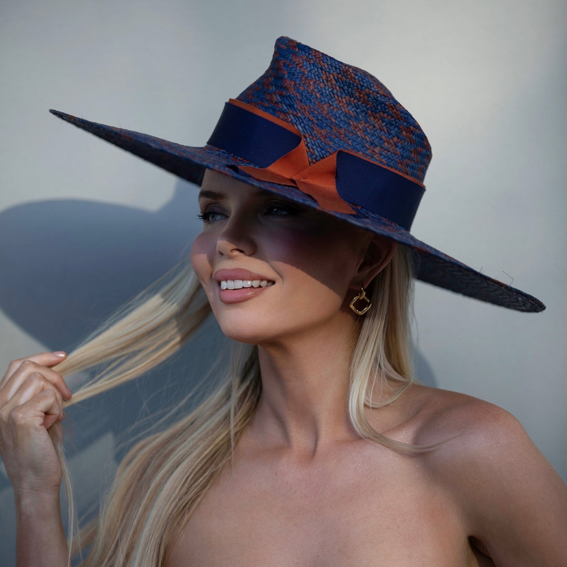 Part of the summer Panama range, this hand-woven, striking straw features navy and terracotta brown. Finished with a matching double ribbon.