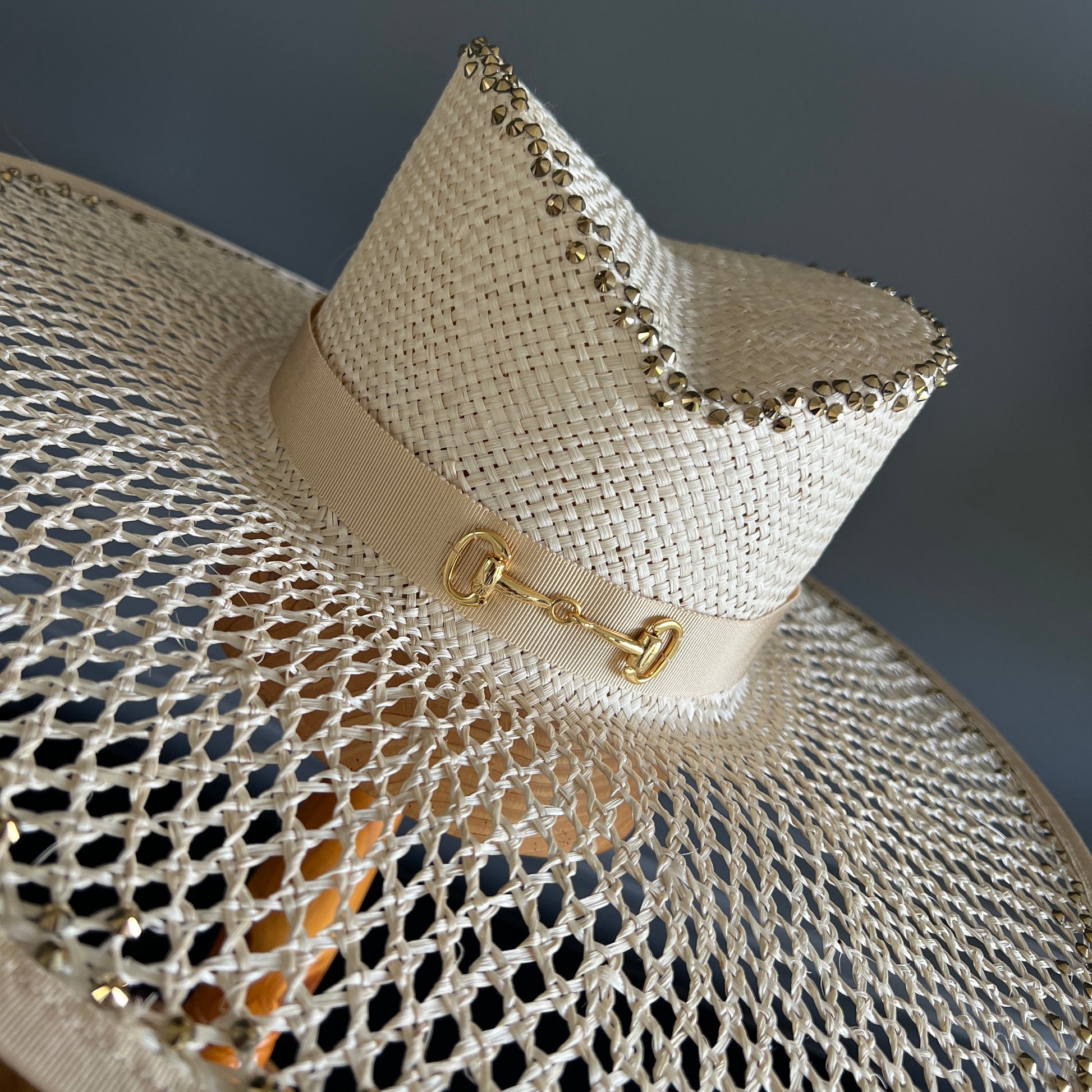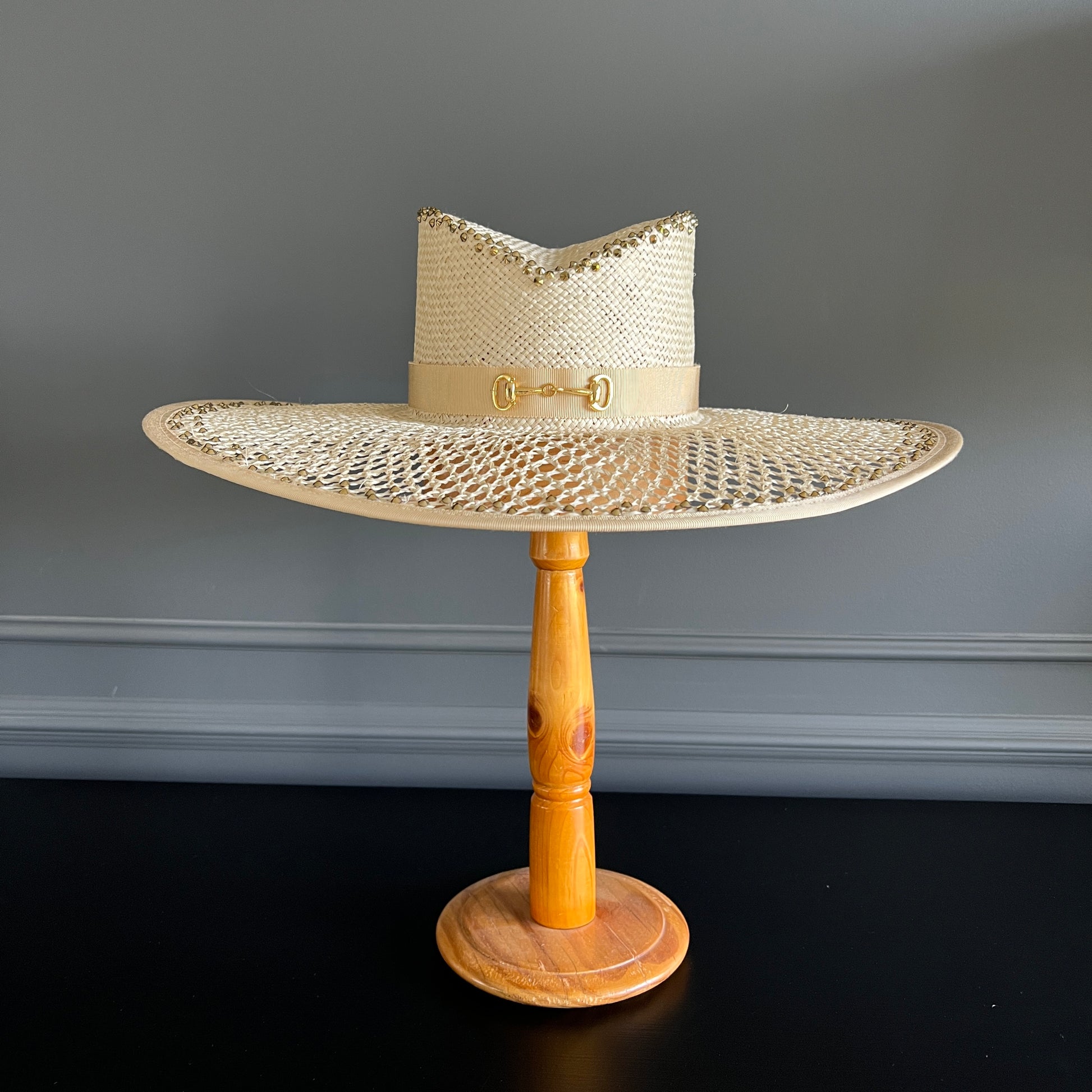 A stunning textured natural straw, finished with gold buckle and gold Swarovski crystals (crown and brim).