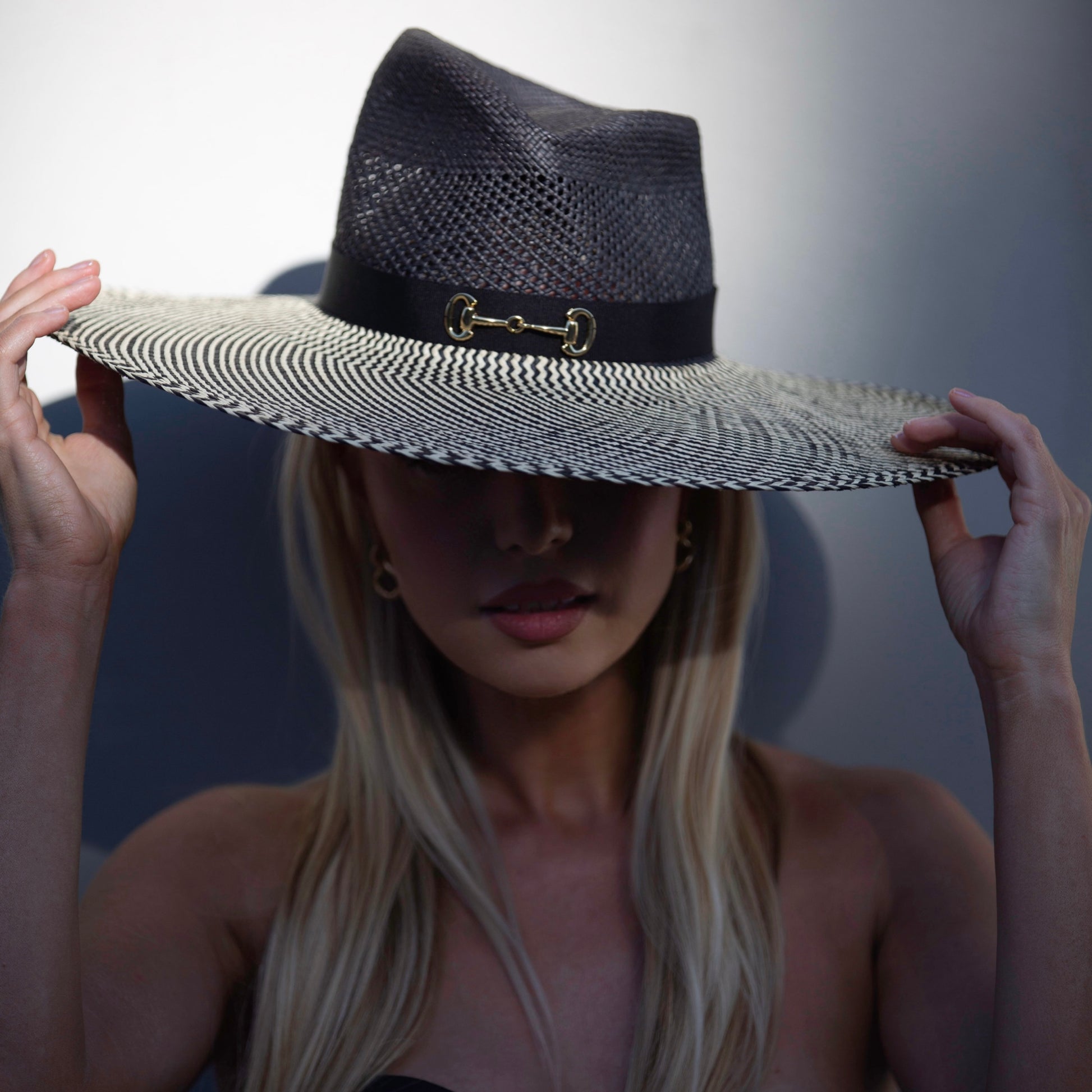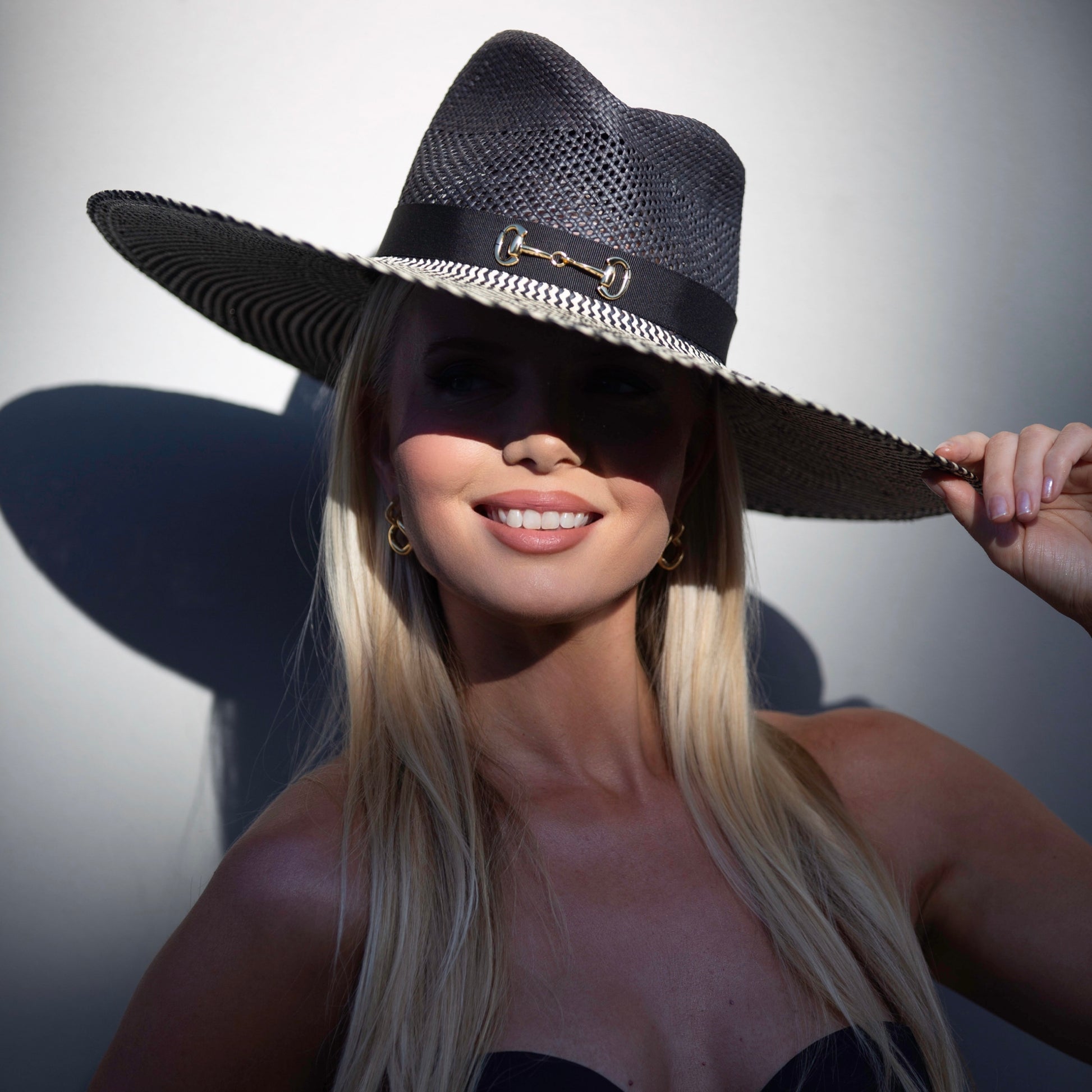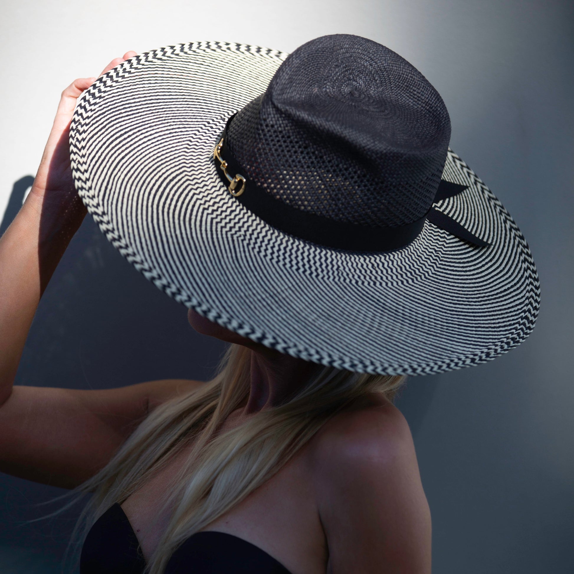 Part of the summer Panama range; this statement piece is crafted in black/natural straw and finished with a black ribbon + gold buckle.